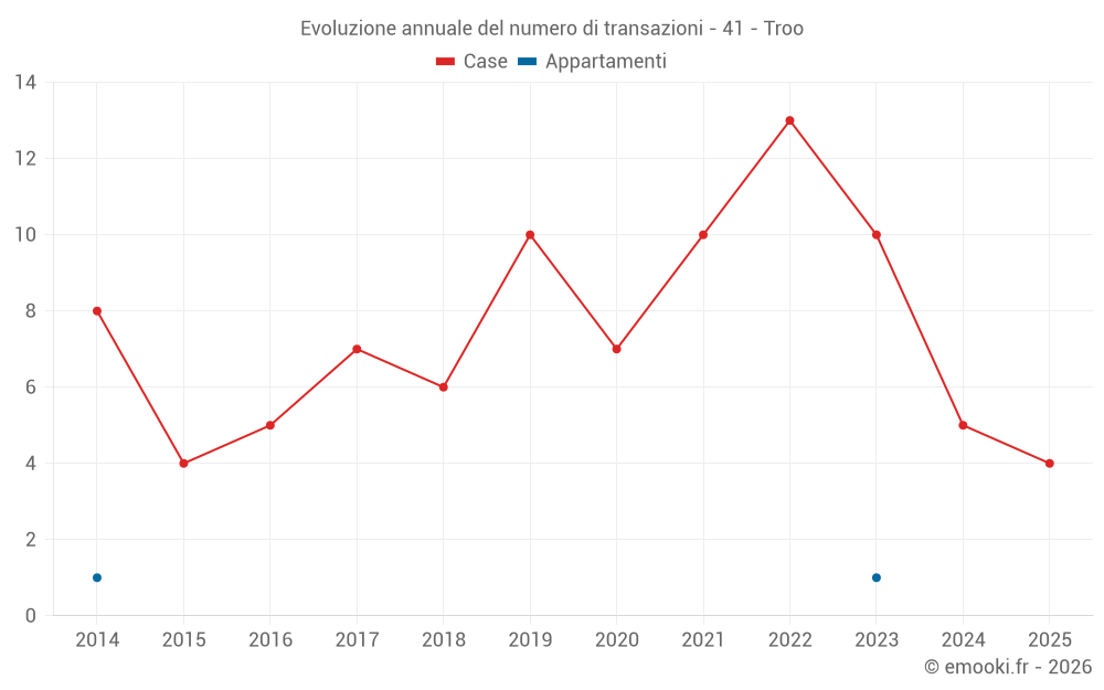 Il prezzo mediano sulle 16 transazioni di case degli ultimi 24 mesi nel comune di Troo era di 1 712 € al metro quadrato per un valore patrimoniale mediano di 157 500 €. In questo periodo il 60% delle transazioni era tra 1 024 e 2 396 € al metro quadrato (dal 2° all'8° decile).