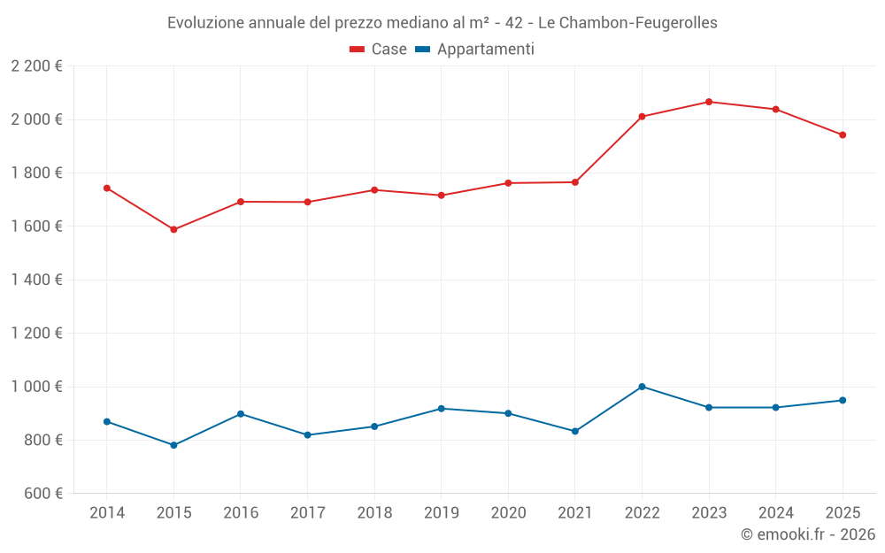Il prezzo mediano sulle 32 transazioni di case degli ultimi 12 mesi nel comune di Le Chambon-Feugerolles era di 2 090 € al metro quadrato per un valore patrimoniale mediano di 182 000 €. In questo periodo il 60% delle transazioni era tra 1 704 e 2 365 € al metro quadrato (dal 2° all'8° decile).