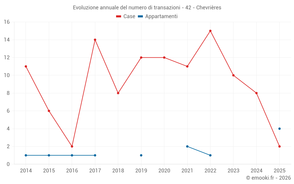 Il prezzo mediano sulle 14 transazioni di case degli ultimi 24 mesi nel comune di Chevrières era di 2 094 € al metro quadrato per un valore patrimoniale mediano di 230 250 €. In questo periodo il 60% delle transazioni era tra 1 507 e 2 555 € al metro quadrato (dal 2° all'8° decile).