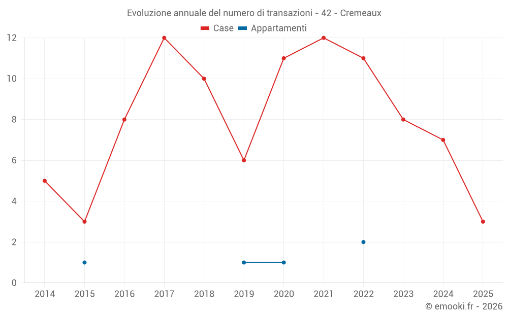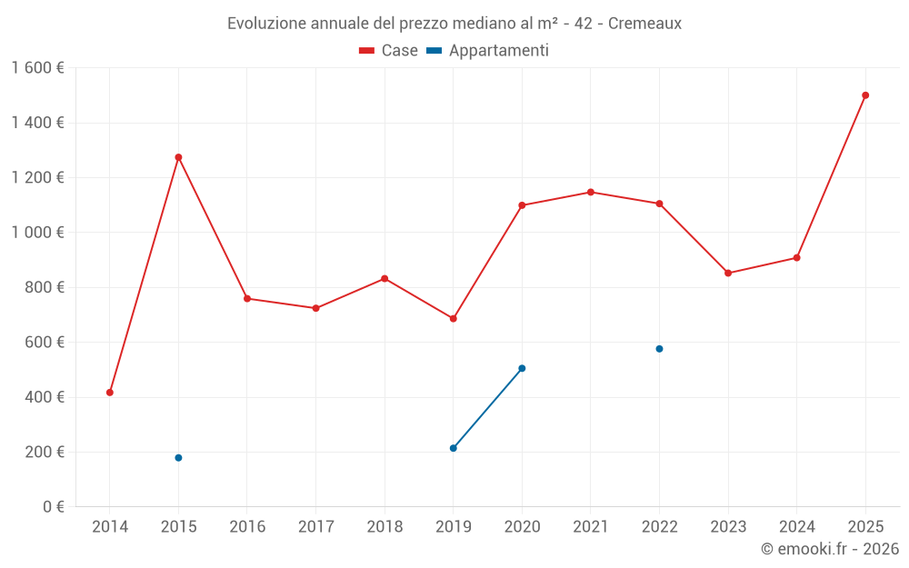 Il prezzo mediano sulle 14 transazioni di case degli ultimi 24 mesi nel comune di Cremeaux era di 919 € al metro quadrato per un valore patrimoniale mediano di 93 000 €. In questo periodo il 60% delle transazioni era tra 747 e 1 718 € al metro quadrato (dal 2° all'8° decile).