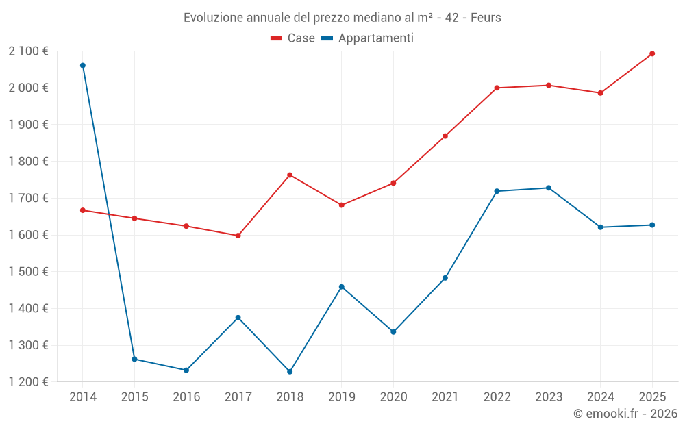 Il prezzo mediano sulle 22 transazioni di appartamenti degli ultimi 6 mesi nel comune di Feurs era di 1 627 € al metro quadrato per un valore patrimoniale mediano di 109 000 €. In questo periodo il 60% delle transazioni era tra 1 399 e 2 100 € al metro quadrato (dal 2° all'8° decile).