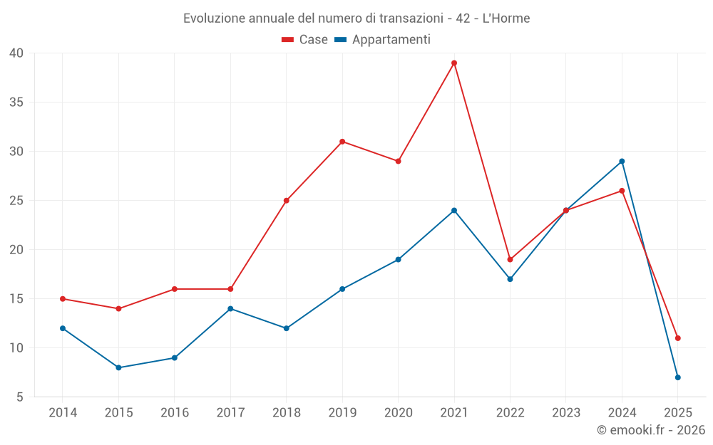 Il prezzo mediano sulle 25 transazioni di case degli ultimi 12 mesi nel comune di L'Horme era di 2 407 € al metro quadrato per un valore patrimoniale mediano di 245 200 €. In questo periodo il 60% delle transazioni era tra 2 030 e 2 857 € al metro quadrato (dal 2° all'8° decile).