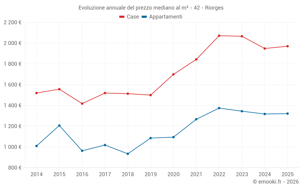 Il prezzo mediano sulle 37 transazioni di case degli ultimi 6 mesi nel comune di Riorges era di 1 971 € al metro quadrato per un valore patrimoniale mediano di 181 000 €. In questo periodo il 60% delle transazioni era tra 1 362 e 2 454 € al metro quadrato (dal 2° all'8° decile).