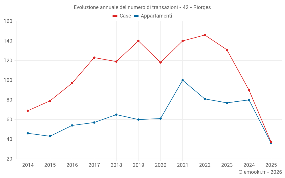 Il prezzo mediano sulle 36 transazioni di appartamenti degli ultimi 6 mesi nel comune di Riorges era di 1 322 € al metro quadrato per un valore patrimoniale mediano di 70 500 €. In questo periodo il 60% delle transazioni era tra 1 031 e 1 680 € al metro quadrato (dal 2° all'8° decile).