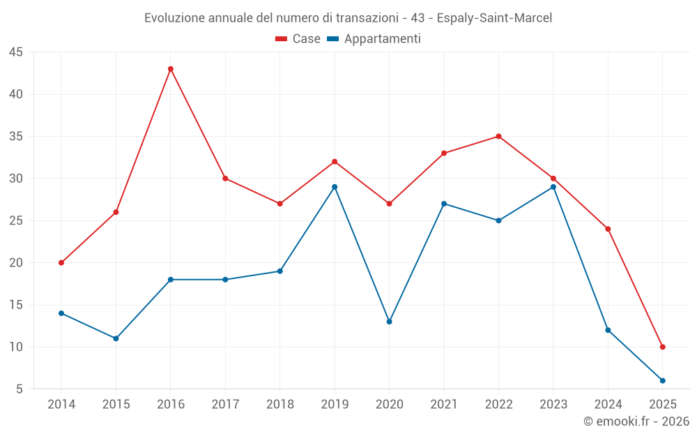 Il prezzo mediano sulle 24 transazioni di case degli ultimi 12 mesi nel comune di Espaly-Saint-Marcel era di 1 733 € al metro quadrato per un valore patrimoniale mediano di 154 500 €. In questo periodo il 60% delle transazioni era tra 1 059 e 2 433 € al metro quadrato (dal 2° all'8° decile).