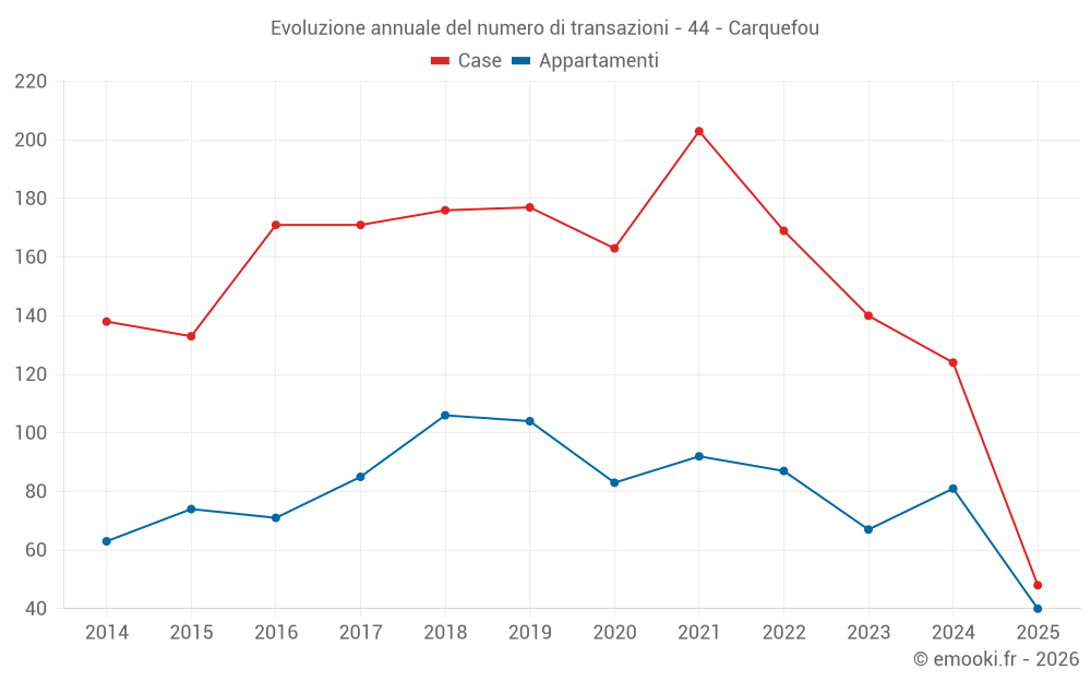 Il prezzo mediano sulle 48 transazioni di case degli ultimi 6 mesi nel comune di Carquefou era di 3 352 € al metro quadrato per un valore patrimoniale mediano di 340 000 €. In questo periodo il 60% delle transazioni era tra 2 753 e 3 835 € al metro quadrato (dal 2° all'8° decile).