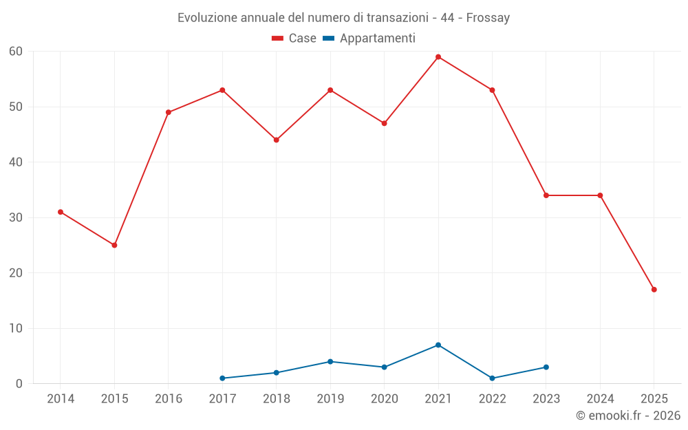 Il prezzo mediano sulle 32 transazioni di case degli ultimi 12 mesi nel comune di Frossay era di 2 423 € al metro quadrato per un valore patrimoniale mediano di 220 000 €. In questo periodo il 60% delle transazioni era tra 1 558 e 2 896 € al metro quadrato (dal 2° all'8° decile).