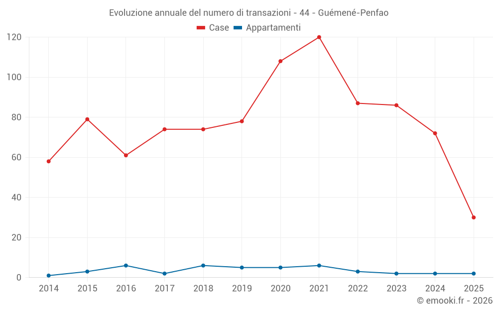 Il prezzo mediano sulle 30 transazioni di case degli ultimi 6 mesi nel comune di Guémené-Penfao era di 1 340 € al metro quadrato per un valore patrimoniale mediano di 118 500 €. In questo periodo il 60% delle transazioni era tra 769 e 2 002 € al metro quadrato (dal 2° all'8° decile).