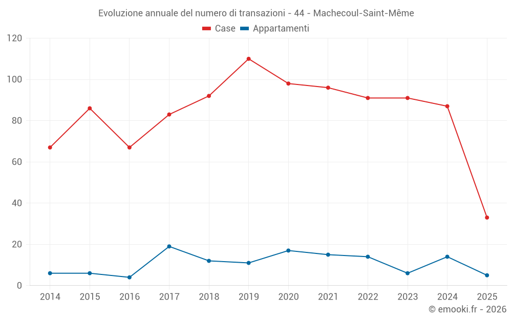 Il prezzo mediano sulle 21 transazioni di appartamenti degli ultimi 24 mesi nel comune di Machecoul-Saint-Même era di 2 007 € al metro quadrato per un valore patrimoniale mediano di 117 000 €. In questo periodo il 60% delle transazioni era tra 1 165 e 2 838 € al metro quadrato (dal 2° all'8° decile).