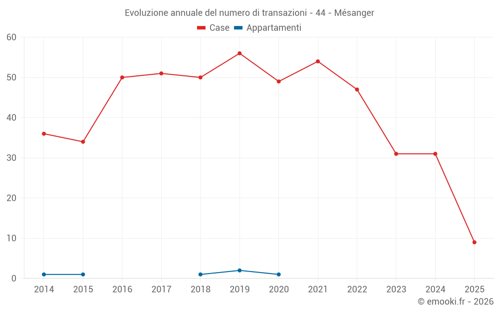 Il prezzo mediano sulle 24 transazioni di case degli ultimi 12 mesi nel comune di Mésanger era di 2 296 € al metro quadrato per un valore patrimoniale mediano di 200 000 €. In questo periodo il 60% delle transazioni era tra 1 847 e 2 853 € al metro quadrato (dal 2° all'8° decile).