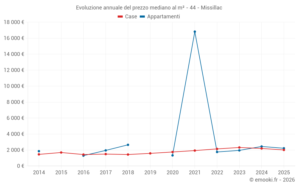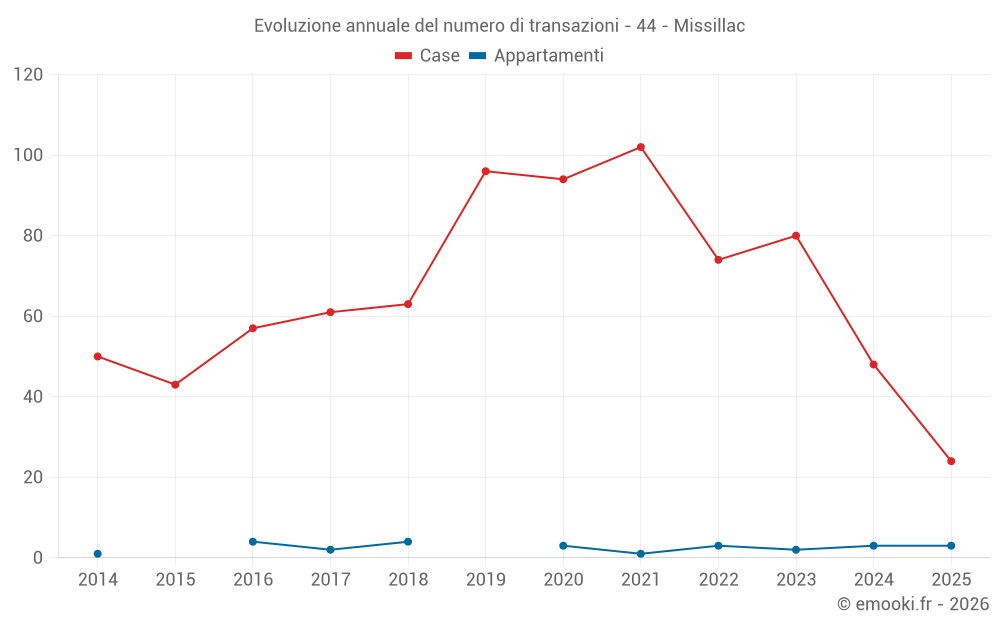 Il prezzo mediano sulle 24 transazioni di case degli ultimi 6 mesi nel comune di Missillac era di 2 011 € al metro quadrato per un valore patrimoniale mediano di 160 000 €. In questo periodo il 60% delle transazioni era tra 1 185 e 2 653 € al metro quadrato (dal 2° all'8° decile).