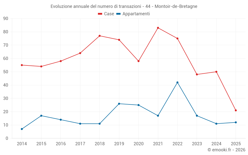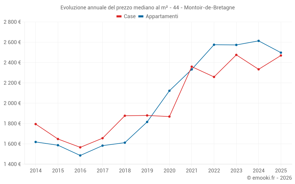 Il prezzo mediano sulle 21 transazioni di case degli ultimi 6 mesi nel comune di Montoir-de-Bretagne era di 2 470 € al metro quadrato per un valore patrimoniale mediano di 200 396 €. In questo periodo il 60% delle transazioni era tra 1 935 e 3 160 € al metro quadrato (dal 2° all'8° decile).