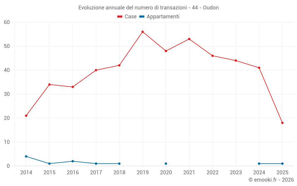 Il prezzo mediano sulle 18 transazioni di case degli ultimi 6 mesi nel comune di Oudon era di 2 392 € al metro quadrato per un valore patrimoniale mediano di 334 250 €. In questo periodo il 60% delle transazioni era tra 1 880 e 2 921 € al metro quadrato (dal 2° all'8° decile).