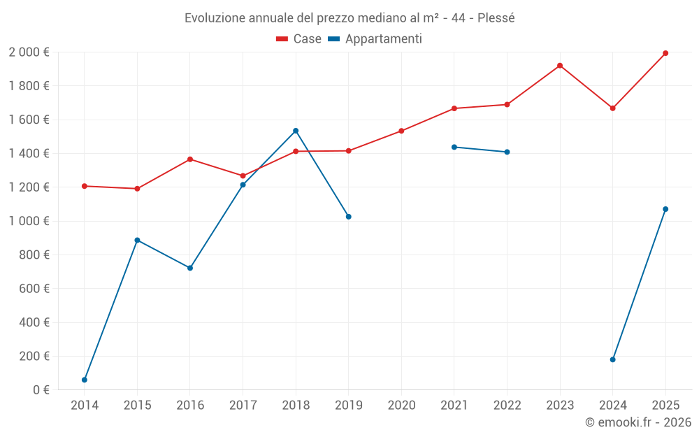 Il prezzo mediano sulle 26 transazioni di case degli ultimi 6 mesi nel comune di Plessé era di 1 994 € al metro quadrato per un valore patrimoniale mediano di 183 750 €. In questo periodo il 60% delle transazioni era tra 1 360 e 2 590 € al metro quadrato (dal 2° all'8° decile).