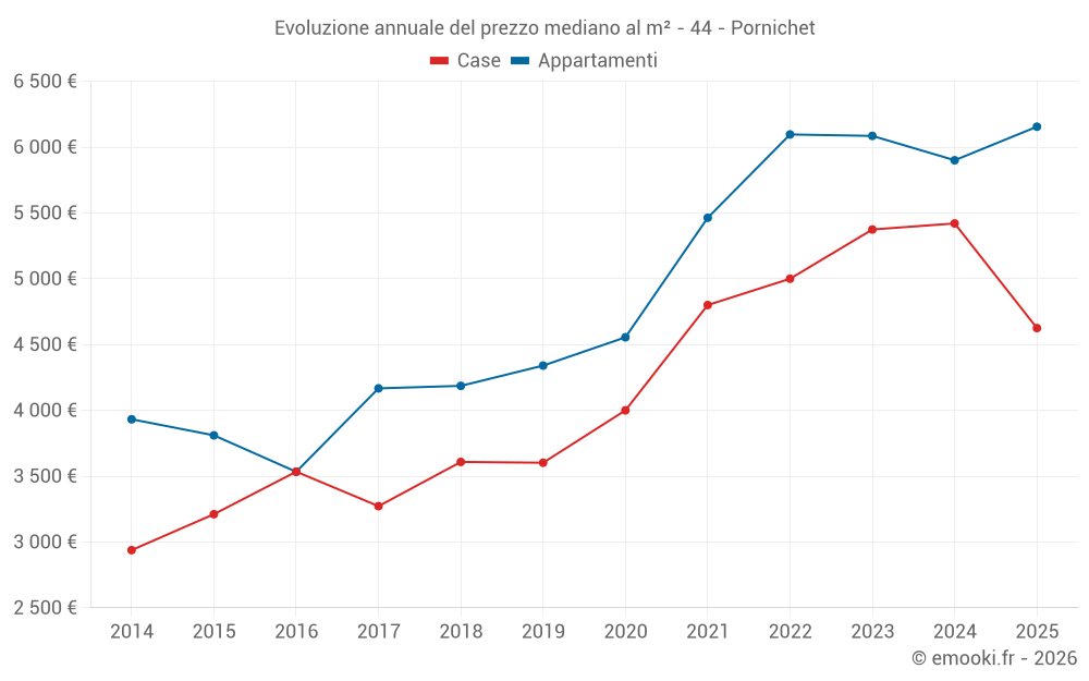 Il prezzo mediano sulle 57 transazioni di case degli ultimi 6 mesi nel comune di Pornichet era di 4 625 € al metro quadrato per un valore patrimoniale mediano di 427 720 €. In questo periodo il 60% delle transazioni era tra 3 857 e 5 924 € al metro quadrato (dal 2° all'8° decile).