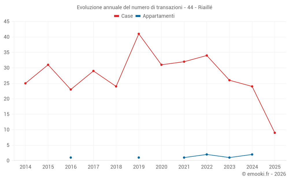 Il prezzo mediano sulle 24 transazioni di case degli ultimi 12 mesi nel comune di Riaillé era di 1 674 € al metro quadrato per un valore patrimoniale mediano di 155 000 €. In questo periodo il 60% delle transazioni era tra 1 291 e 2 020 € al metro quadrato (dal 2° all'8° decile).