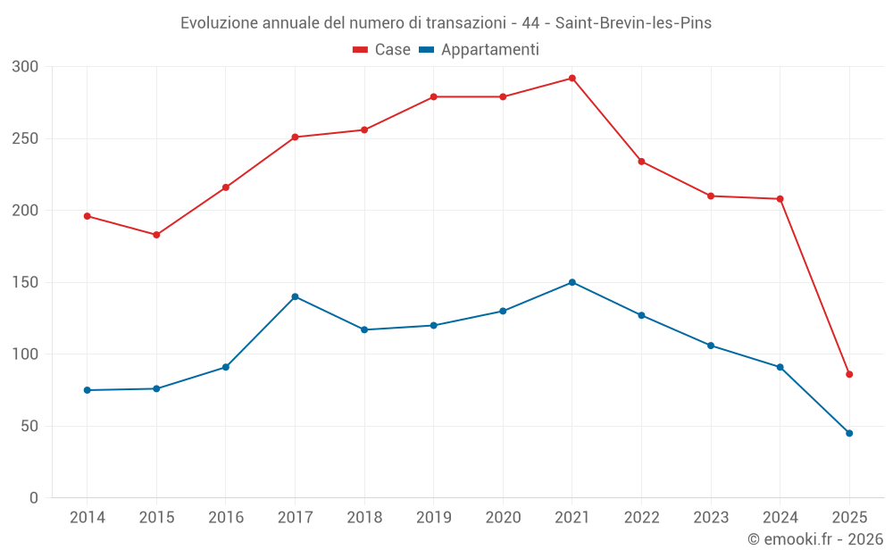 Il prezzo mediano sulle 41 transazioni di case degli ultimi 3 mesi nel comune di Saint-Brevin-les-Pins era di 3 675 € al metro quadrato per un valore patrimoniale mediano di 290 000 €. In questo periodo il 60% delle transazioni era tra 3 000 e 4 111 € al metro quadrato (dal 2° all'8° decile).