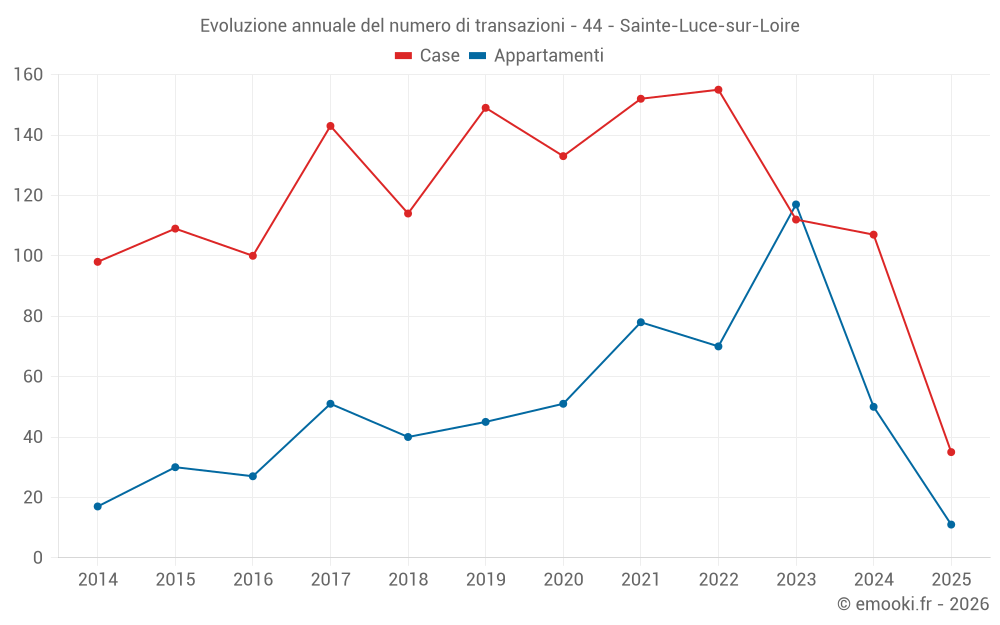 Il prezzo mediano sulle 35 transazioni di case degli ultimi 6 mesi nel comune di Sainte-Luce-sur-Loire era di 3 414 € al metro quadrato per un valore patrimoniale mediano di 295 000 €. In questo periodo il 60% delle transazioni era tra 2 744 e 3 747 € al metro quadrato (dal 2° all'8° decile).