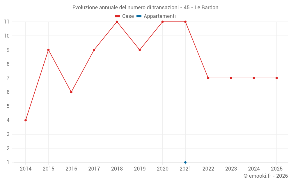 Il prezzo mediano sulle 17 transazioni di case degli ultimi 24 mesi nel comune di Le Bardon era di 1 797 € al metro quadrato per un valore patrimoniale mediano di 189 500 €. In questo periodo il 60% delle transazioni era tra 1 503 e 2 209 € al metro quadrato (dal 2° all'8° decile).
