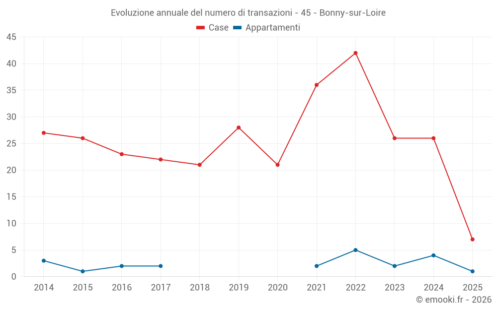 Il prezzo mediano sulle 23 transazioni di case degli ultimi 12 mesi nel comune di Bonny-sur-Loire era di 1 147 € al metro quadrato per un valore patrimoniale mediano di 87 000 €. In questo periodo il 60% delle transazioni era tra 659 e 1 555 € al metro quadrato (dal 2° all'8° decile).