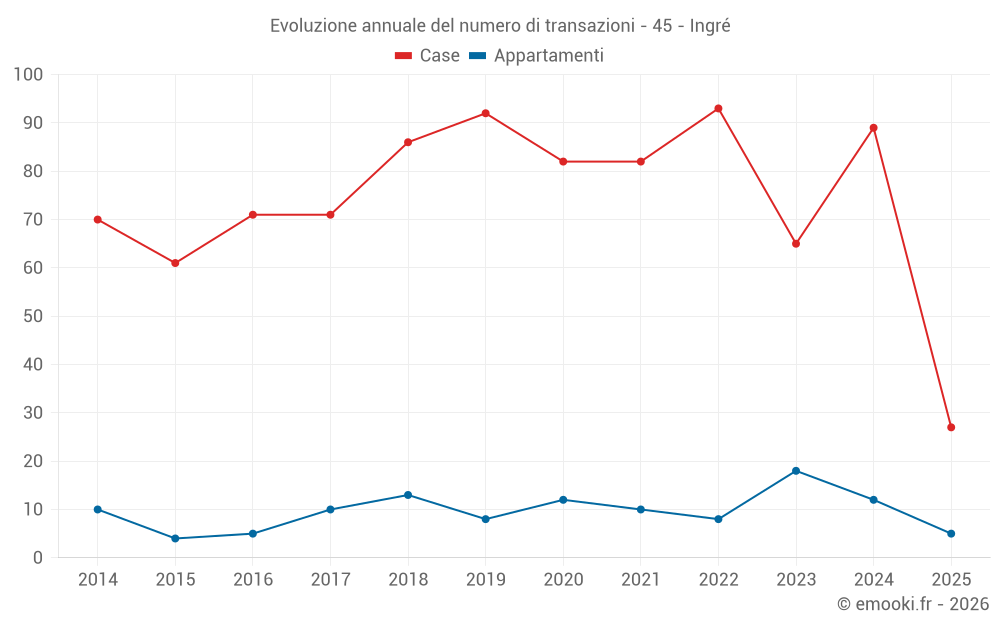 Il prezzo mediano sulle 27 transazioni di case degli ultimi 6 mesi nel comune di Ingré era di 2 264 € al metro quadrato per un valore patrimoniale mediano di 245 000 €. In questo periodo il 60% delle transazioni era tra 1 900 e 2 570 € al metro quadrato (dal 2° all'8° decile).