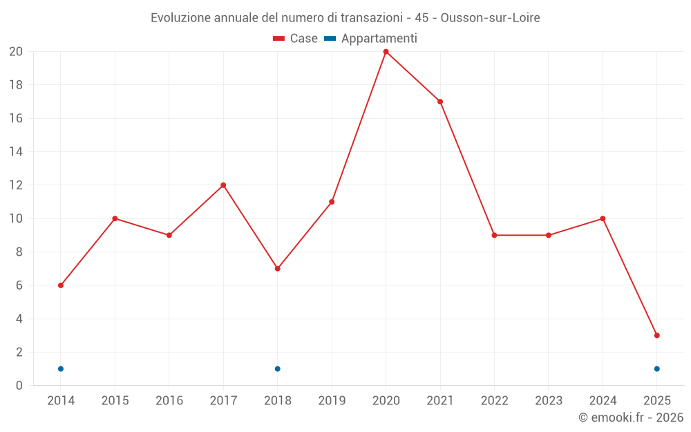 Il prezzo mediano sulle 19 transazioni di case degli ultimi 24 mesi nel comune di Ousson-sur-Loire era di 1 222 € al metro quadrato per un valore patrimoniale mediano di 126 000 €. In questo periodo il 60% delle transazioni era tra 819 e 1 708 € al metro quadrato (dal 2° all'8° decile).