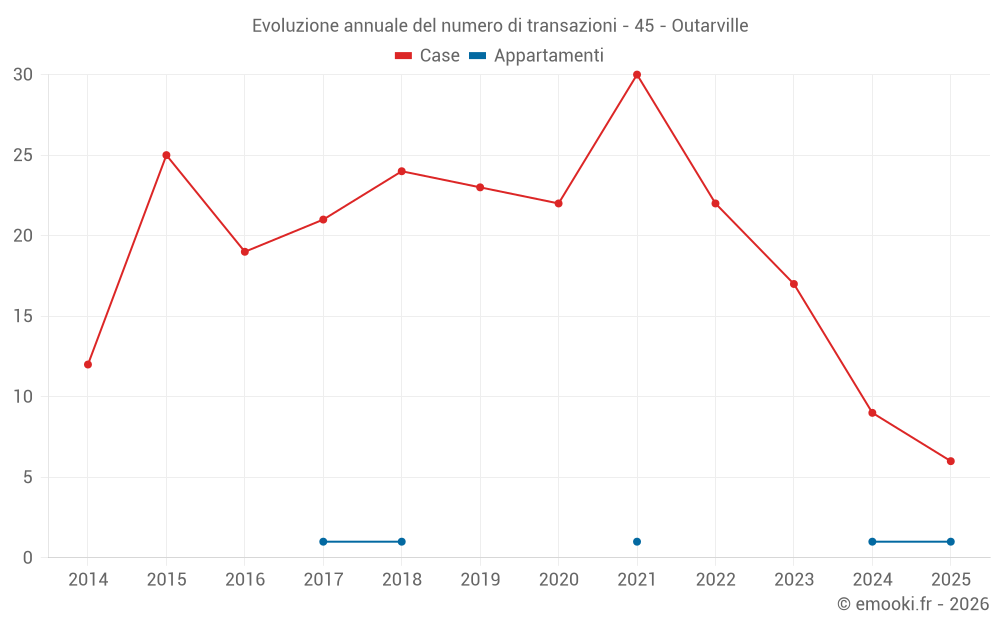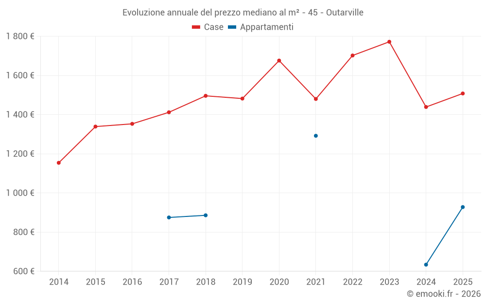 Il prezzo mediano sulle 25 transazioni di case degli ultimi 24 mesi nel comune di Outarville era di 1 697 € al metro quadrato per un valore patrimoniale mediano di 174 150 €. In questo periodo il 60% delle transazioni era tra 1 070 e 2 252 € al metro quadrato (dal 2° all'8° decile).