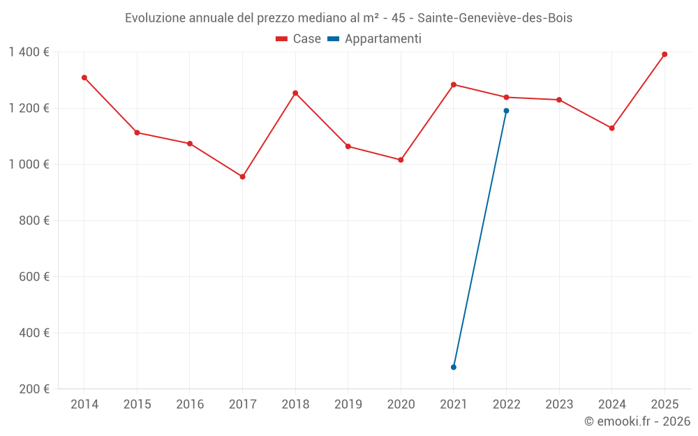 Il prezzo mediano sulle 19 transazioni di case degli ultimi 12 mesi nel comune di Sainte-Geneviève-des-Bois era di 1 353 € al metro quadrato per un valore patrimoniale mediano di 100 000 €. In questo periodo il 60% delle transazioni era tra 1 005 e 1 846 € al metro quadrato (dal 2° all'8° decile).