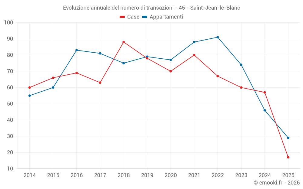 Il prezzo mediano sulle 29 transazioni di appartamenti degli ultimi 6 mesi nel comune di Saint-Jean-le-Blanc era di 2 398 € al metro quadrato per un valore patrimoniale mediano di 119 550 €. In questo periodo il 60% delle transazioni era tra 1 917 e 3 237 € al metro quadrato (dal 2° all'8° decile).