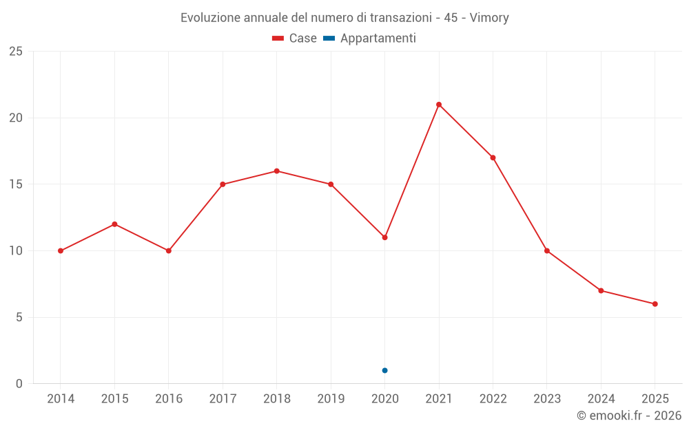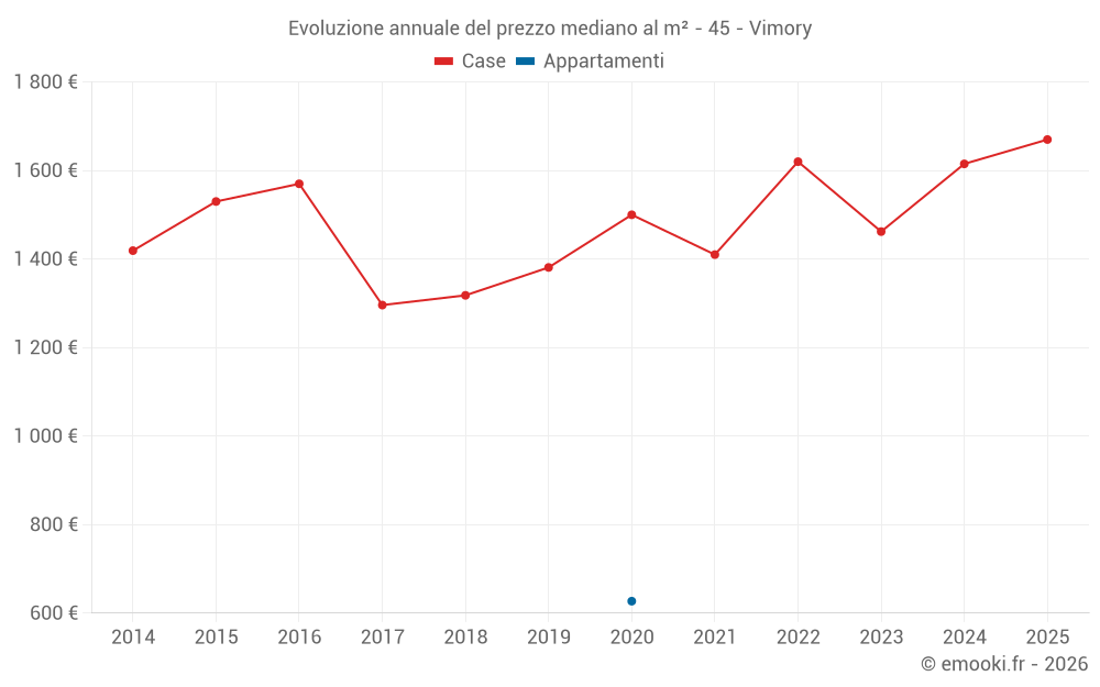 Il prezzo mediano sulle 20 transazioni di case degli ultimi 24 mesi nel comune di Vimory era di 1 572 € al metro quadrato per un valore patrimoniale mediano di 171 720 €. In questo periodo il 60% delle transazioni era tra 1 182 e 1 985 € al metro quadrato (dal 2° all'8° decile).