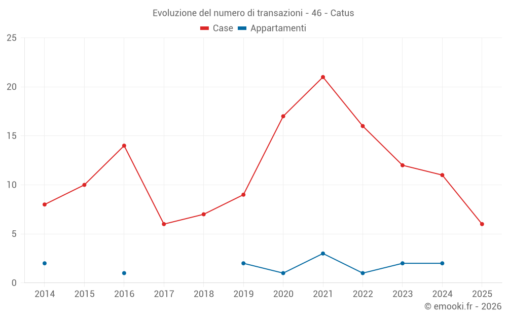 Il prezzo mediano sulle 23 transazioni di case degli ultimi 24 mesi nel comune di Catus era di 1 446 € al metro quadrato per un valore patrimoniale mediano di 135 500 €. In questo periodo il 60% delle transazioni era tra 1 009 e 2 149 € al metro quadrato (dal 2° all'8° decile).
