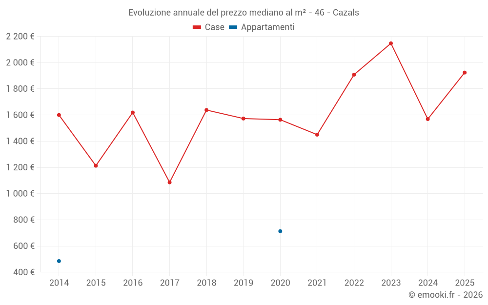 Il prezzo mediano sulle 19 transazioni di case degli ultimi 24 mesi nel comune di Cazals era di 1 778 € al metro quadrato per un valore patrimoniale mediano di 227 000 €. In questo periodo il 60% delle transazioni era tra 1 430 e 2 193 € al metro quadrato (dal 2° all'8° decile).