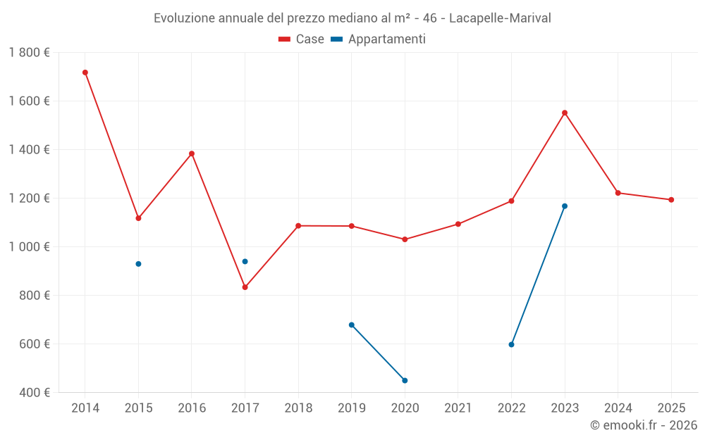 Il prezzo mediano sulle 27 transazioni di case degli ultimi 24 mesi nel comune di Lacapelle-Marival era di 1 235 € al metro quadrato per un valore patrimoniale mediano di 105 000 €. In questo periodo il 60% delle transazioni era tra 508 e 1 670 € al metro quadrato (dal 2° all'8° decile).