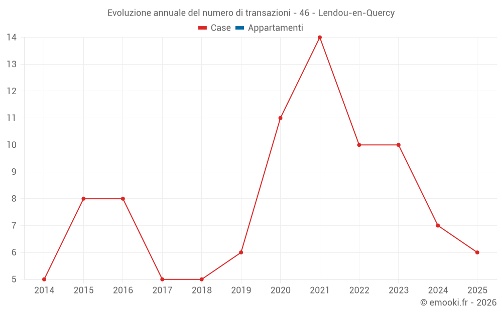 Il prezzo mediano sulle 17 transazioni di case degli ultimi 24 mesi nel comune di Lendou-en-Quercy era di 1 391 € al metro quadrato per un valore patrimoniale mediano di 210 000 €. In questo periodo il 60% delle transazioni era tra 908 e 2 955 € al metro quadrato (dal 2° all'8° decile).