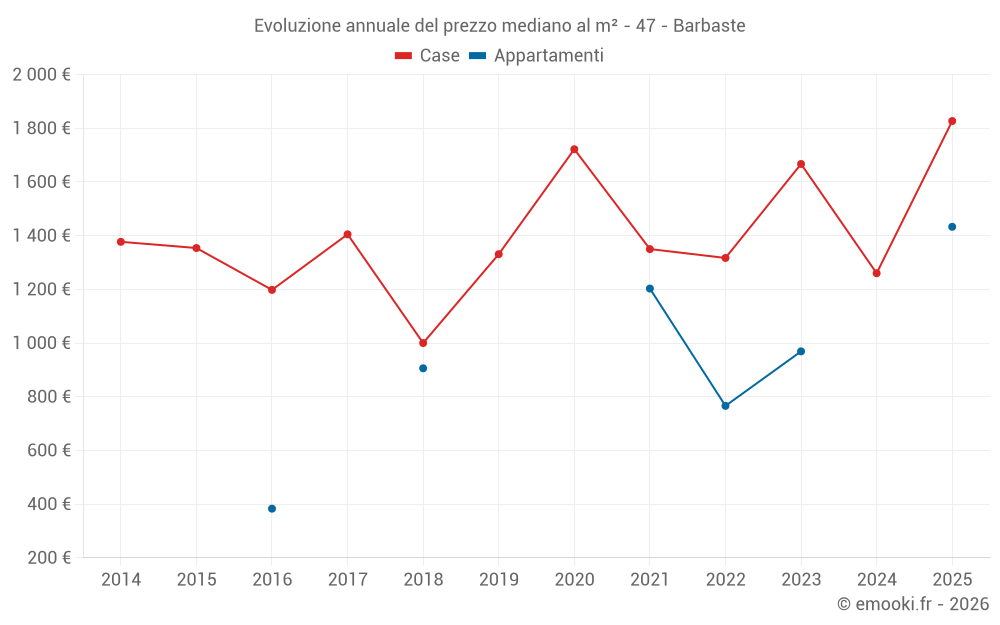 Il prezzo mediano sulle 16 transazioni di case degli ultimi 12 mesi nel comune di Barbaste era di 1 510 € al metro quadrato per un valore patrimoniale mediano di 128 500 €. In questo periodo il 60% delle transazioni era tra 937 e 2 216 € al metro quadrato (dal 2° all'8° decile).