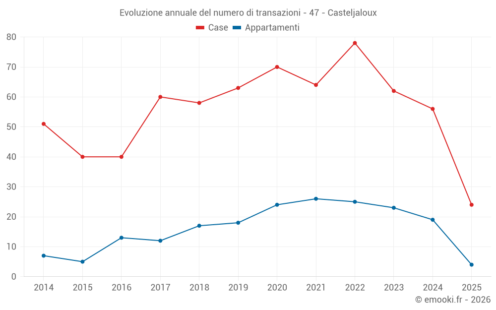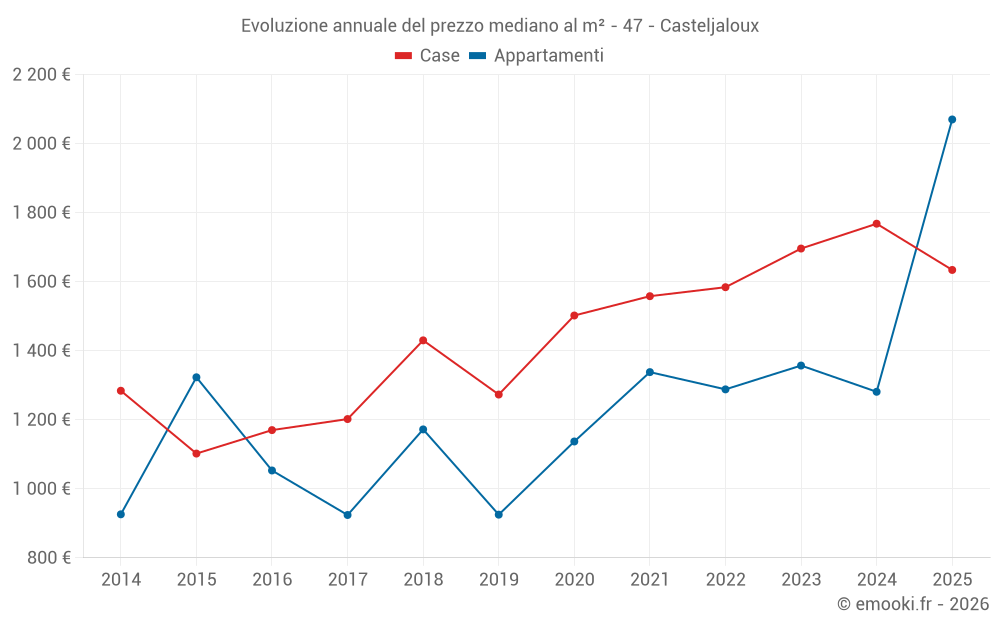 Il prezzo mediano sulle 35 transazioni di appartamenti degli ultimi 24 mesi nel comune di Casteljaloux era di 1 411 € al metro quadrato per un valore patrimoniale mediano di 84 370 €. In questo periodo il 60% delle transazioni era tra 986 e 2 057 € al metro quadrato (dal 2° all'8° decile).