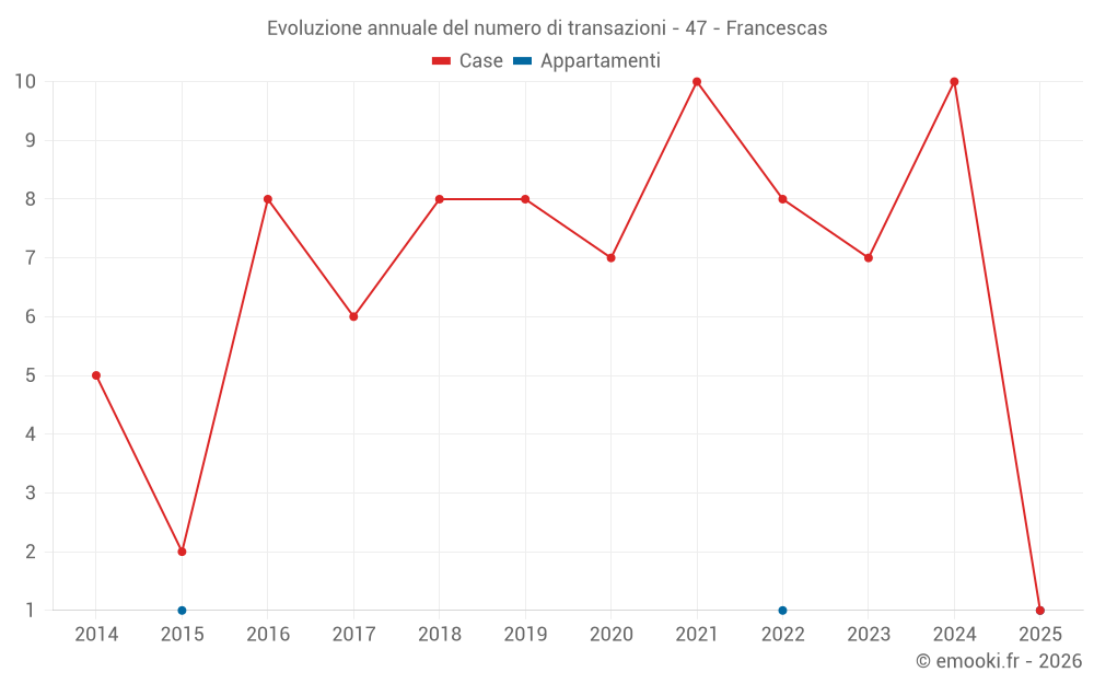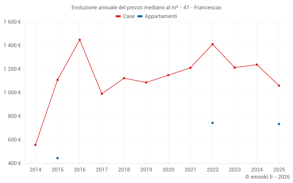Il prezzo mediano sulle 15 transazioni di case degli ultimi 24 mesi nel comune di Francescas era di 1 212 € al metro quadrato per un valore patrimoniale mediano di 158 000 €. In questo periodo il 60% delle transazioni era tra 895 e 1 432 € al metro quadrato (dal 2° all'8° decile).