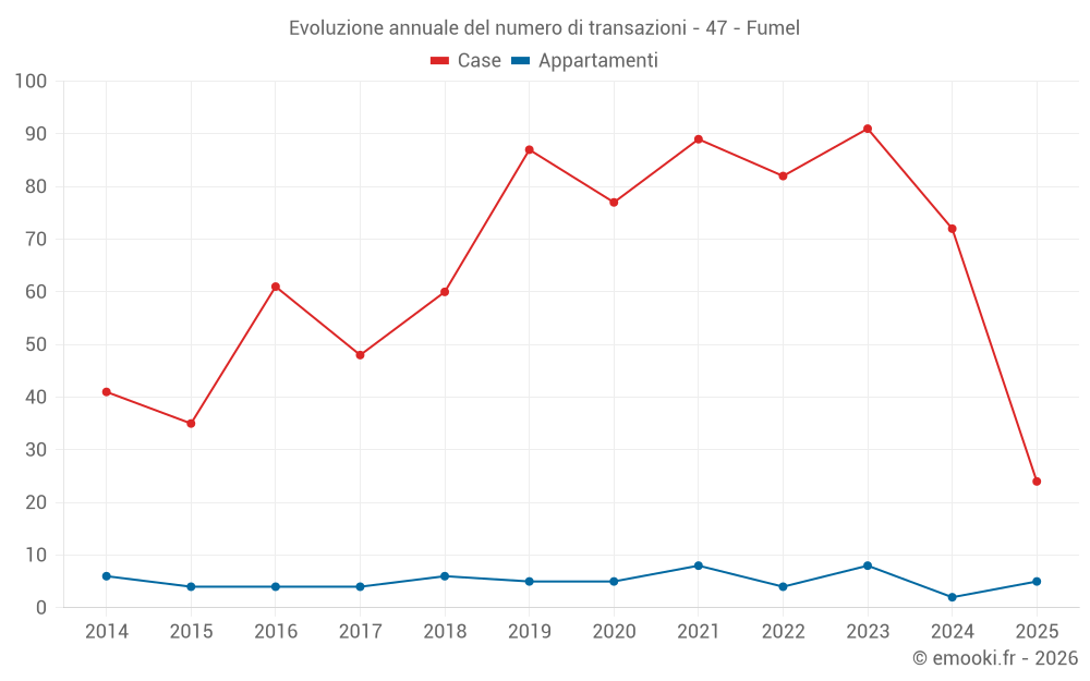 Il prezzo mediano sulle 24 transazioni di case degli ultimi 6 mesi nel comune di Fumel era di 982 € al metro quadrato per un valore patrimoniale mediano di 100 450 €. In questo periodo il 60% delle transazioni era tra 611 e 1 915 € al metro quadrato (dal 2° all'8° decile).