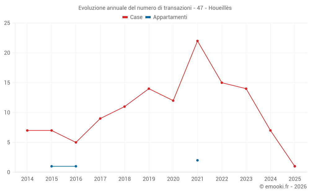 Il prezzo mediano sulle 15 transazioni di case degli ultimi 24 mesi nel comune di Houeillès era di 1 603 € al metro quadrato per un valore patrimoniale mediano di 125 000 €. In questo periodo il 60% delle transazioni era tra 1 086 e 2 269 € al metro quadrato (dal 2° all'8° decile).