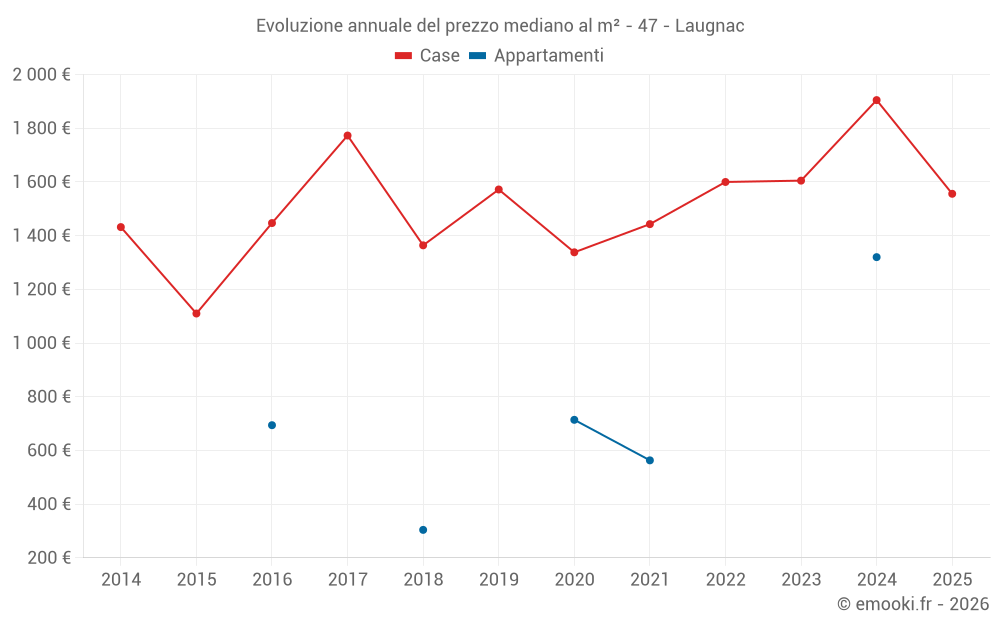 Il prezzo mediano sulle 20 transazioni di case degli ultimi 24 mesi nel comune di Laugnac era di 1 630 € al metro quadrato per un valore patrimoniale mediano di 140 000 €. In questo periodo il 60% delle transazioni era tra 756 e 2 202 € al metro quadrato (dal 2° all'8° decile).