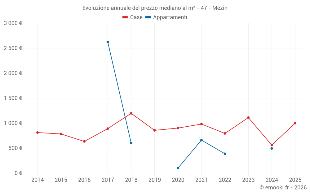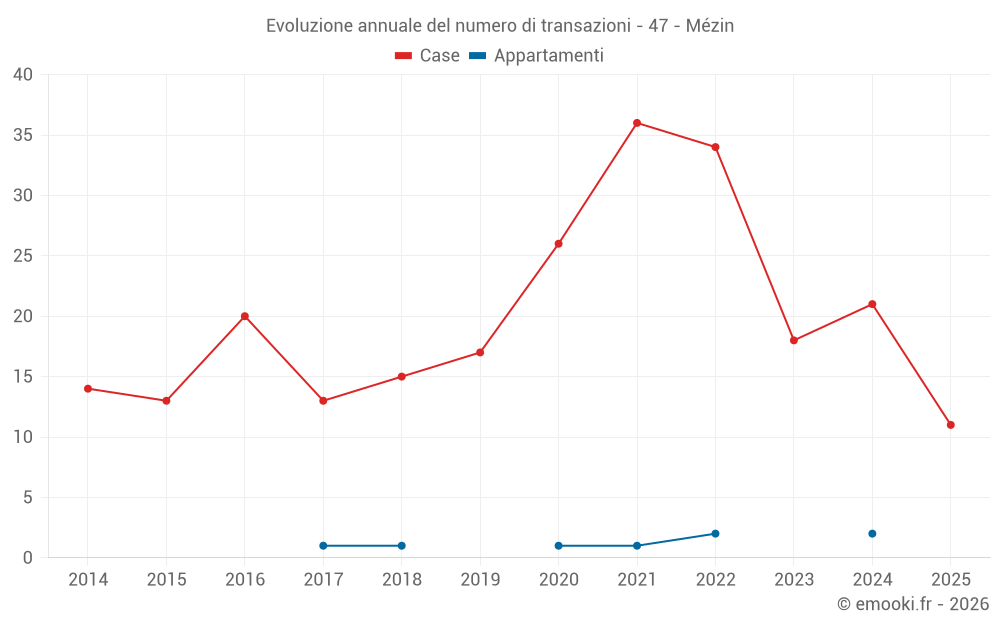 Il prezzo mediano sulle 21 transazioni di case degli ultimi 12 mesi nel comune di Mézin era di 734 € al metro quadrato per un valore patrimoniale mediano di 60 000 €. In questo periodo il 60% delle transazioni era tra 446 e 1 448 € al metro quadrato (dal 2° all'8° decile).