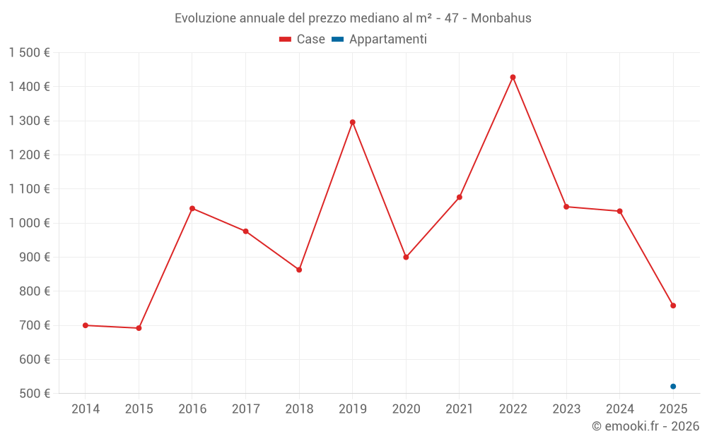 Il prezzo mediano sulle 18 transazioni di case degli ultimi 24 mesi nel comune di Monbahus era di 846 € al metro quadrato per un valore patrimoniale mediano di 97 959 €. In questo periodo il 60% delle transazioni era tra 362 e 1 572 € al metro quadrato (dal 2° all'8° decile).