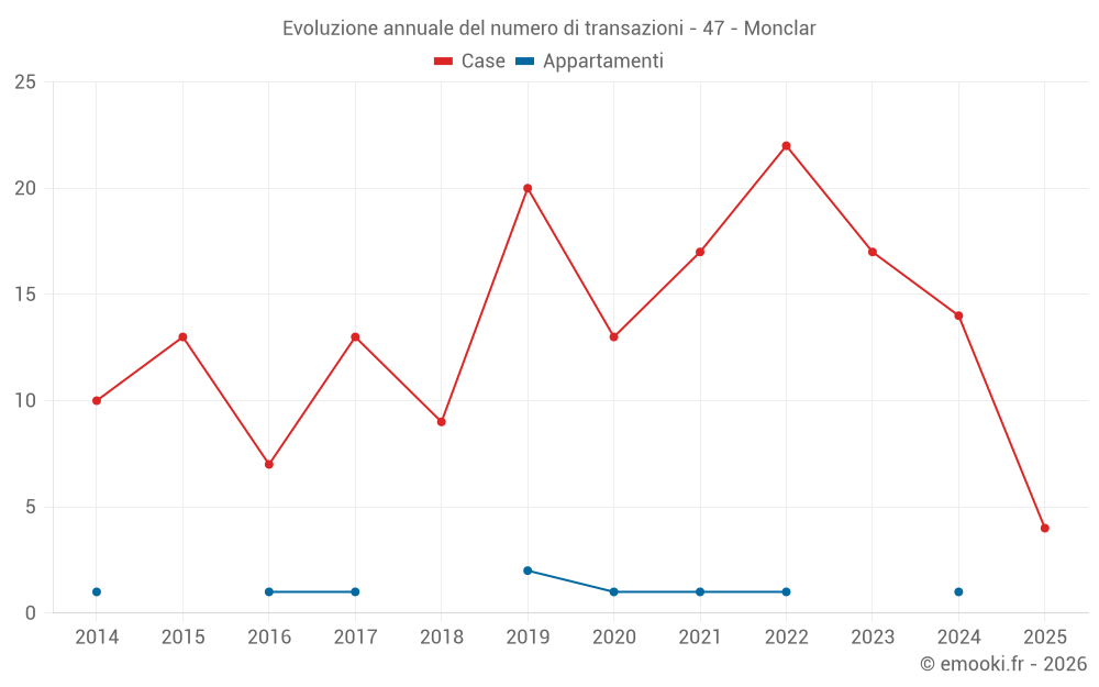 Il prezzo mediano sulle 26 transazioni di case degli ultimi 24 mesi nel comune di Monclar era di 992 € al metro quadrato per un valore patrimoniale mediano di 91 700 €. In questo periodo il 60% delle transazioni era tra 521 e 1 667 € al metro quadrato (dal 2° all'8° decile).