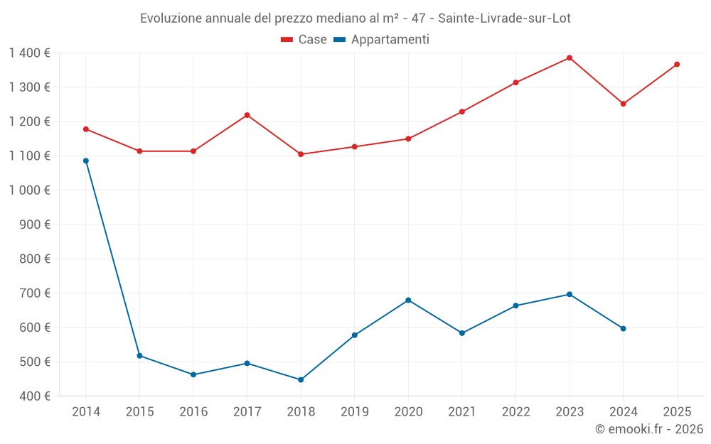 Il prezzo mediano sulle 27 transazioni di case degli ultimi 6 mesi nel comune di Sainte-Livrade-sur-Lot era di 1 367 € al metro quadrato per un valore patrimoniale mediano di 102 400 €. In questo periodo il 60% delle transazioni era tra 712 e 1 754 € al metro quadrato (dal 2° all'8° decile).