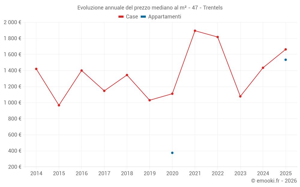 Il prezzo mediano sulle 20 transazioni di case degli ultimi 24 mesi nel comune di Trentels era di 1 434 € al metro quadrato per un valore patrimoniale mediano di 157 500 €. In questo periodo il 60% delle transazioni era tra 803 e 1 901 € al metro quadrato (dal 2° all'8° decile).