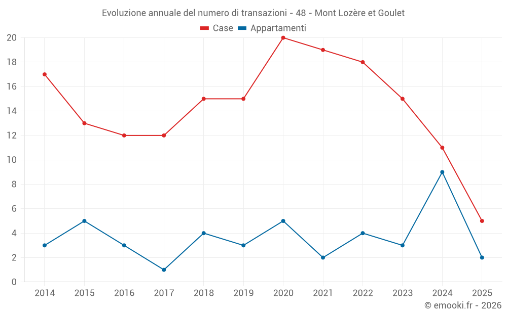 Il prezzo mediano sulle 24 transazioni di case degli ultimi 24 mesi nel comune di Mont Lozère et Goulet era di 1 163 € al metro quadrato per un valore patrimoniale mediano di 110 000 €. In questo periodo il 60% delle transazioni era tra 618 e 2 042 € al metro quadrato (dal 2° all'8° decile).
