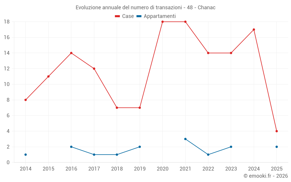 Il prezzo mediano sulle 28 transazioni di case degli ultimi 24 mesi nel comune di Chanac era di 1 388 € al metro quadrato per un valore patrimoniale mediano di 150 000 €. In questo periodo il 60% delle transazioni era tra 905 e 2 258 € al metro quadrato (dal 2° all'8° decile).