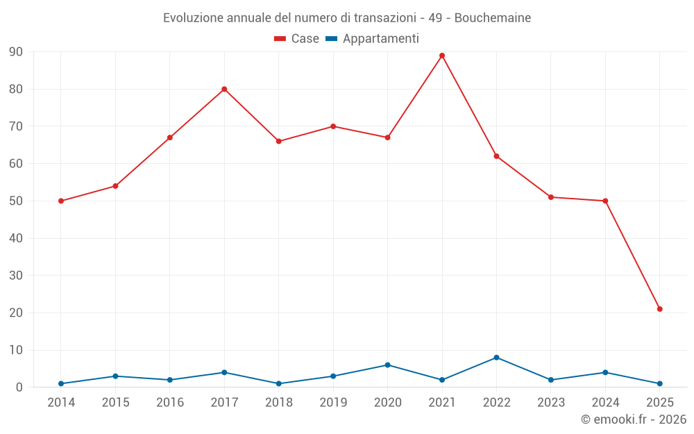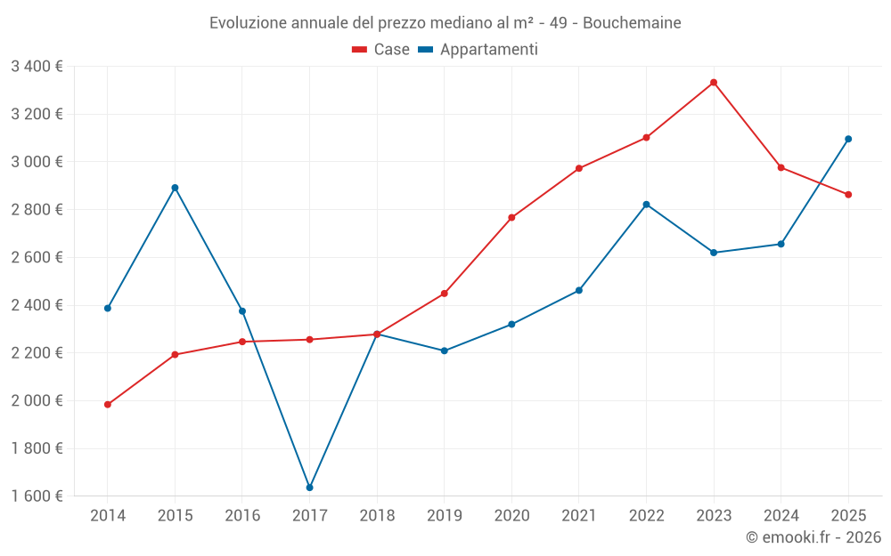 Il prezzo mediano sulle 21 transazioni di case degli ultimi 6 mesi nel comune di Bouchemaine era di 2 863 € al metro quadrato per un valore patrimoniale mediano di 280 000 €. In questo periodo il 60% delle transazioni era tra 2 268 e 3 153 € al metro quadrato (dal 2° all'8° decile).