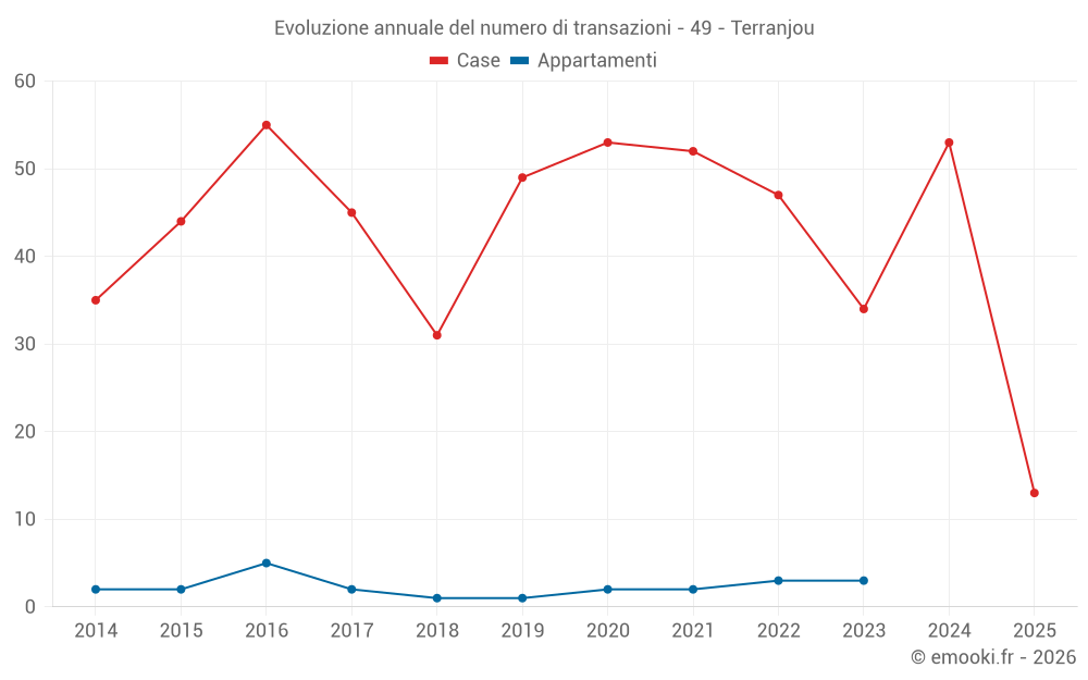 Il prezzo mediano sulle 42 transazioni di case degli ultimi 12 mesi nel comune di Terranjou era di 1 799 € al metro quadrato per un valore patrimoniale mediano di 187 500 €. In questo periodo il 60% delle transazioni era tra 1 085 e 2 216 € al metro quadrato (dal 2° all'8° decile).