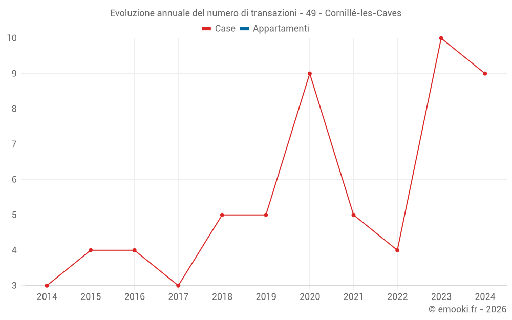 Il prezzo mediano sulle 16 transazioni di case degli ultimi 24 mesi nel comune di Cornillé-les-Caves era di 1 930 € al metro quadrato per un valore patrimoniale mediano di 242 750 €. In questo periodo il 60% delle transazioni era tra 1 782 e 2 536 € al metro quadrato (dal 2° all'8° decile).